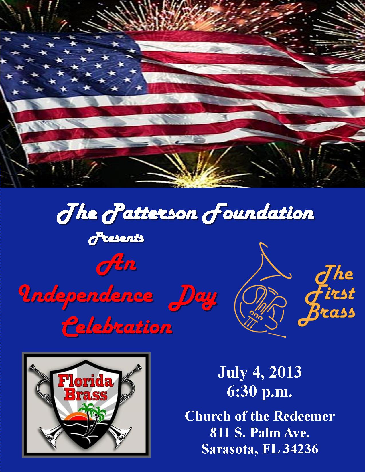 This is a free concert with the First Brass partnering with the Patterson Foundation’s “Legacy of Valor”, the Florida Brass, Church of the Redeemer and Cell Phones for Soldiers. We will begin playing at 6:00 p.m. and will continue until just before the annual fireworks start.